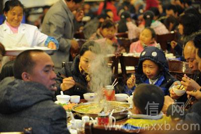 室外雪下得正“High”,火鍋店里卻熱火朝天。華昌路上重慶老火鍋店的楊老板中午特意叫伙計加夠了客人愛點的豌豆尖、大白菜等!氨茸蛱於噘I了一倍!睏罾习逭f,近段時間每天的菜金也就300元左右,昨天他把菜金提高了一倍,還不到6點半,店里所有的桌子全部坐滿。