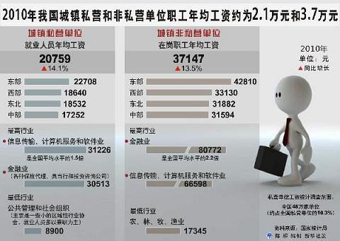 “五一”長(zhǎng)假剛過(guò),國(guó)家統(tǒng)計(jì)局就發(fā)布了2010年全國(guó)平均工資的主要情況。相對(duì)于去年3.3%的年度物價(jià)漲幅,中國(guó)的非私營(yíng)和私營(yíng)行業(yè)平均工資年度漲幅分別達(dá)到了13.5%和14.1%。 國(guó)家統(tǒng)計(jì)局的數(shù)據(jù)顯示,2010年全國(guó)城鎮(zhèn)非私營(yíng)單位在崗職工年平均工資為37147元,比上年增長(zhǎng)13.5%,增幅提高1.5個(gè)百分點(diǎn)。 同期,全國(guó)城鎮(zhèn)私營(yíng)單位就業(yè)人員年平均工資為20759元,同比增長(zhǎng)14.1%,增幅提高7.5個(gè)百分點(diǎn)。 中國(guó)的非私營(yíng)單位主要包括股份制、外商投資、國(guó)有以及集體企業(yè)。 從地域分布來(lái)看,無(wú)論是城鎮(zhèn)非私營(yíng)單位還是私營(yíng)單位,在崗職工平均工資水平都呈東部最高、中部最低的情況。其中,城鎮(zhèn)非私營(yíng)單位在崗職工年平均工資由高到低排列為東部、西部、東北和中部。上海、北京、西藏為全國(guó)非私營(yíng)單位在崗職工年平均工資最高的三大地區(qū)。 若按行業(yè)分,金融行業(yè)依舊拔得包括非私營(yíng)和私營(yíng)在內(nèi)的各行業(yè)收入頭籌。 非私營(yíng)單位中,年平均工資最高的三個(gè)行業(yè)分別是金融業(yè)80772元,是全國(guó)平均水平的2.2倍,超過(guò)了2009年2.1倍的水平;信息傳輸、計(jì)算機(jī)服務(wù)和軟件業(yè)66598元,是全國(guó)平均水平的1.8倍;科學(xué)研究、技術(shù)服務(wù)和地質(zhì)勘察業(yè)57316元,是全國(guó)平均水平的1.5倍。 而非私營(yíng)單位年平均工資最低的三個(gè)行業(yè)分別是農(nóng)、林、牧、漁業(yè)(17345元),住宿和餐飲業(yè)(23812元),水利、環(huán)境和公共設(shè)施管理業(yè)(27229元)。最高行業(yè)與最低行業(yè)年平均工資之比為4.7∶1。記者發(fā)現(xiàn),這一比例與2009年持平. |
