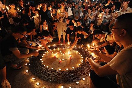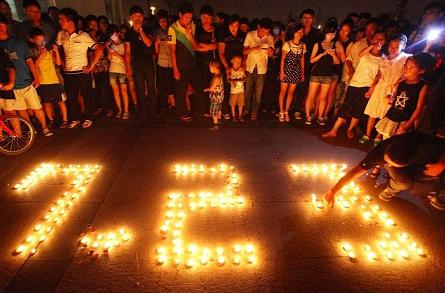 7月25日晚,溫州市民聚在世紀(jì)廣場,點(diǎn)燃蠟燭,放飛孔明燈,哀悼7·23動(dòng)車追尾事故中的遇難者,為傷者祈福.