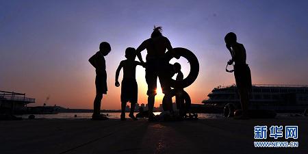 8月4日,幾名小朋友在湘江邊作戲水前的準(zhǔn)備。當(dāng)日,湖南省會(huì)長(zhǎng)沙最高溫度達(dá)到40℃ ,為今年入夏以來(lái)的最高氣溫,湖南省氣象臺(tái)已發(fā)布今年首個(gè)高溫紅色預(yù)警信號(hào)。